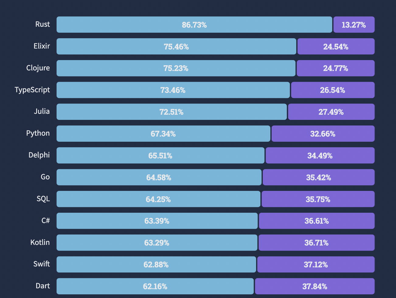 우선 긴 말 필요없이 StackOverflow 설문조사 자료를 통해 확인할 수 있었던 것은 Rust가 7년 연속 가장 개발자들에게 사랑받는 언어라는 것이다. 7년 그것도 무려 7년이나!🤨 작년 말 드넓은 개발세계를 맛본 뒤로 굉장히 스스로를 우물 안 개구리라고 생각하게 되었고, 현실에 안주하는 삶을 살아오고 있었다는 것을 느끼게 되었었다. 본디 천성이 안정적이고 평범한 삶을 사는 것을 원하는 사람이지만, 평범하게 사는 것도 어려워진 세상에서 과연 내 인생의 모토가 얼마나 효과적인 원동력이 될 것이라는 생각을 한 터일 테다. 안주하는 삶을 살고 싶진 않았기에, 보다 평범한 삶을 효과적으로 누리기 위해 본격적으로 내 직업적 스킬을 늘리겠다고 다짐하게 되었고 Rust가 왜 사랑받는 언어인지를 찾아보게 되었다.