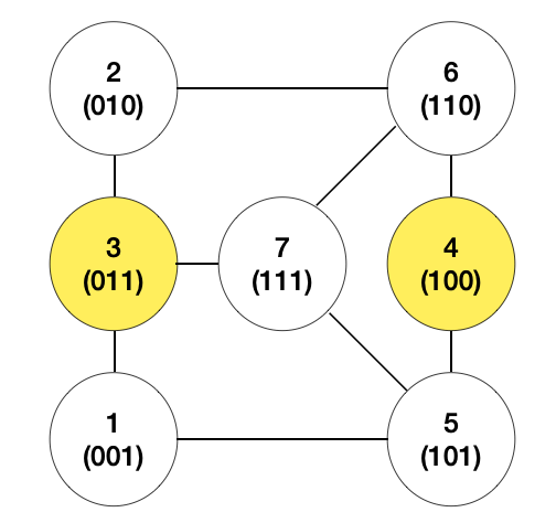 여기서 우리는 이 문제를 조금 더 추상화할 수가 있다. 입력받은 적 있는 비밀번호를 그래프에서의 시작 노드라고 보고, 새로 설정할 비밀번호를 도착 노드라고 본다면 다음과 같은 그래프를 만들 수 있다. 비밀번호를 1 ~ 7(3bit)까지만 입력 가능하다고 가정하자.